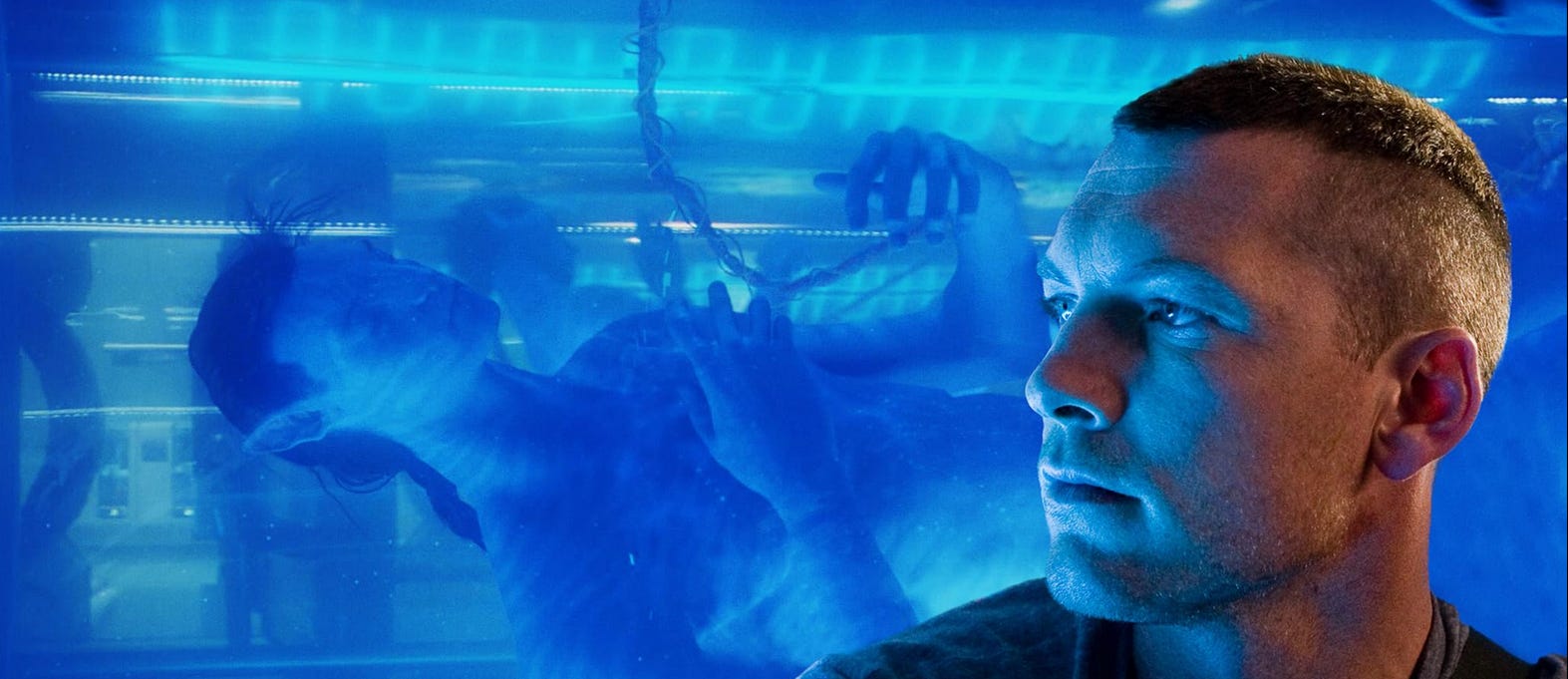 Act I is not neutral. The human world is compressed, metallic, overlit. The camera crowds Jake. Motion is constrained. Edits interrupt. Sound design hums with recycled air and institutional friction. This is not realism. It is sensory withholding. The audience is trained to want release.