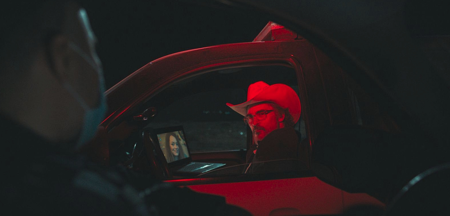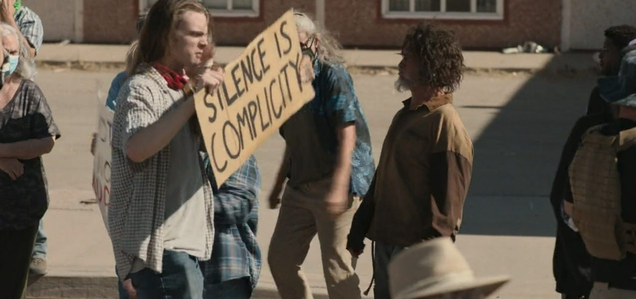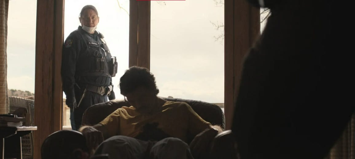 The argument is not medical. It is territorial. The sheriff disputes the line. The Pueblo officer insists on it. The camera holds the horizon wide enough that the man seems small inside it. Geography dominates the frame. The body is incidental.