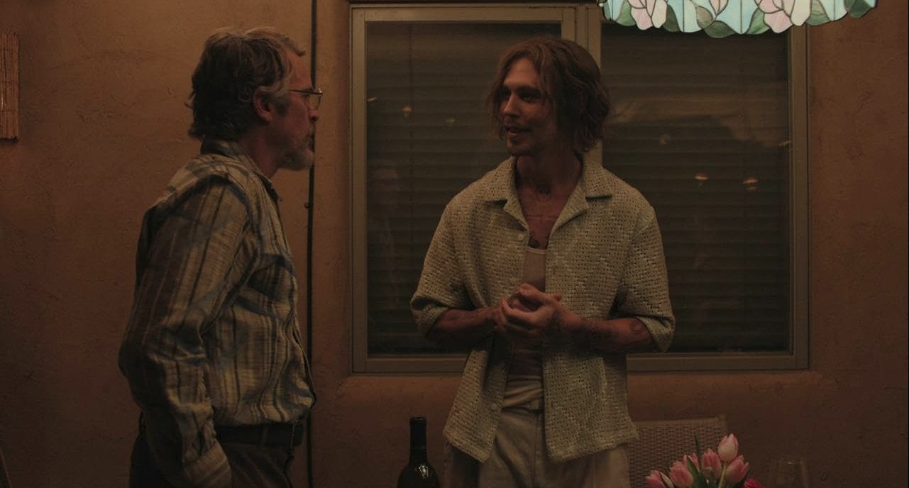There is a moment when he looks at an image of his wife. The camera does not rush him. It holds, wide and indifferent, the desert light bleaching the edges of the room. For a beat, nothing moves.