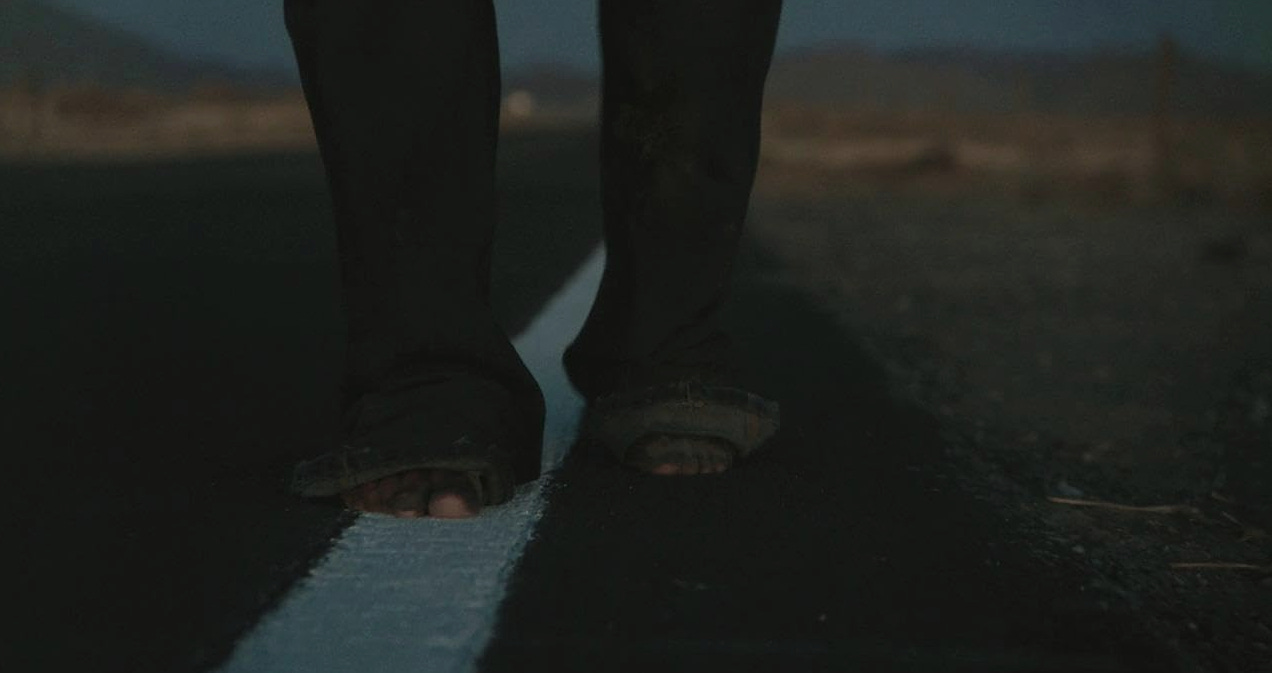 The film’s frames remain static while he crosses them. The horizon does not follow him. The land does not adjust.