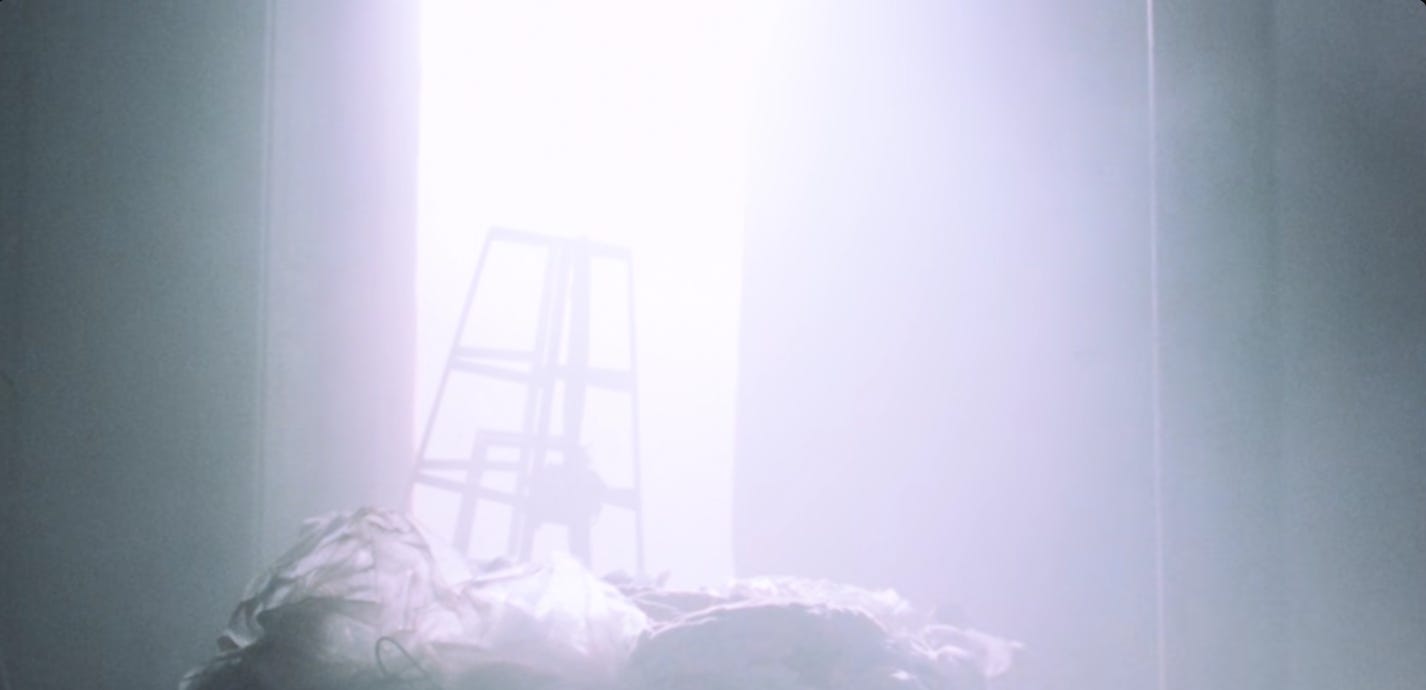 The opening loft is drenched in light: dust floating, an angel frozen mid-gesture, a ladder reaching nowhere, a penny lifted and named lucky. None of it carries authority. The light does not weigh actions or protect anyone. It rehearses belief without enforcing consequence. Meaning is staged early so it will feel natural later.
