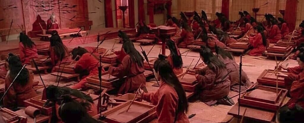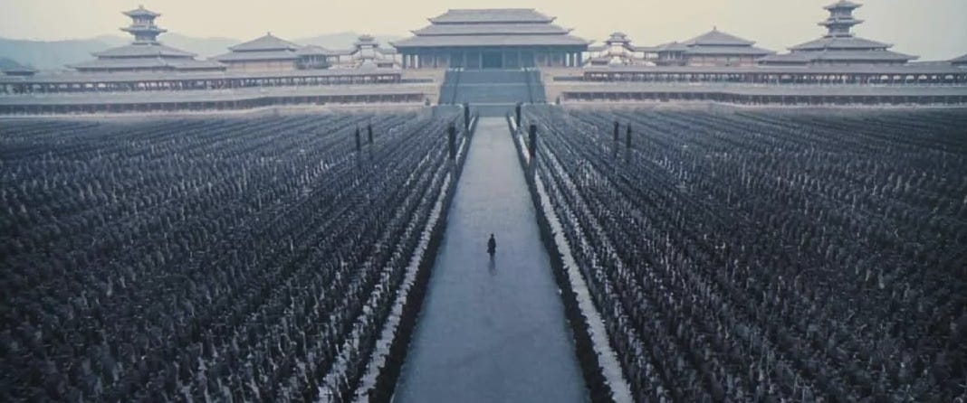Hero does not heighten wuxia violence. It anesthetizes it through suspension.