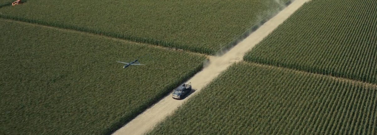 The drone fight is quiet, almost gentle. Cooper grounds it, strips its panels, flight traded for irrigation.