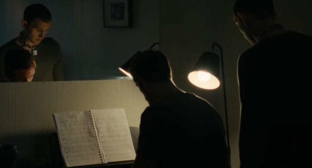In the theater, the lights go down and Colin sits beside him without instruction, without a task to perform. The moment asks nothing of either of them. Ray does not remain. The stillness has no place in the structure he maintains.