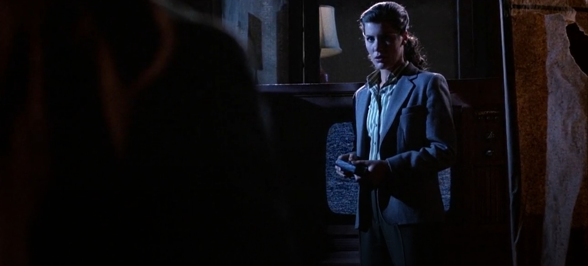The dolly creeps forward but never arrives, motion without progress. The hiss from the TV seeps under their breathing until the room itself begins to vibrate.